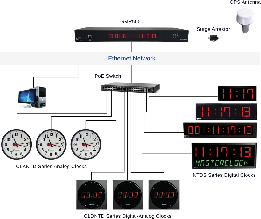 The synchronized clock system typically consists of a “master clock” and multiple “secondary clocks” also known as “slave clocks”. The master clock communicates with all the secondary clocks in the system to provide them with an accurate time source.